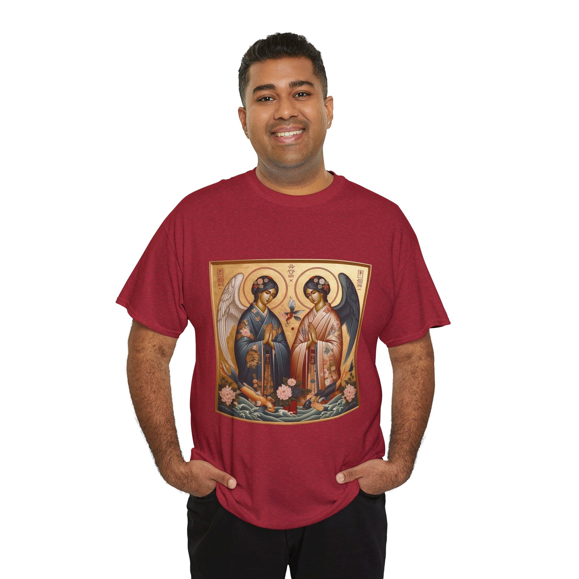 This Angel Sakura Tee from the Sacred Synergy collection showcases a unique fusion of Eastern Orthodox iconography and Japanese aesthetics. The design features serene figures in kimonos with halos, accented by cherry blossoms and ukiyo-e-inspired hues, blending spiritual reverence with cultural harmony.