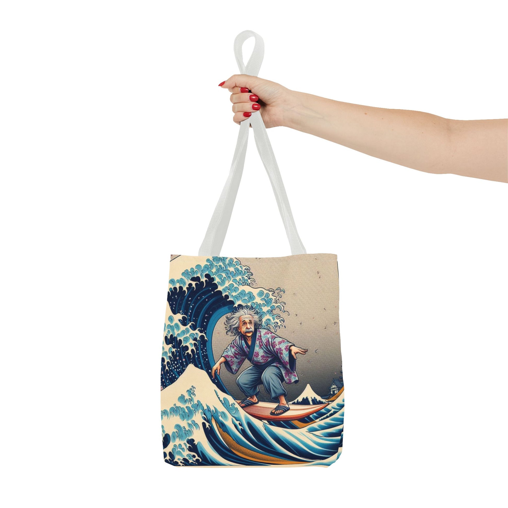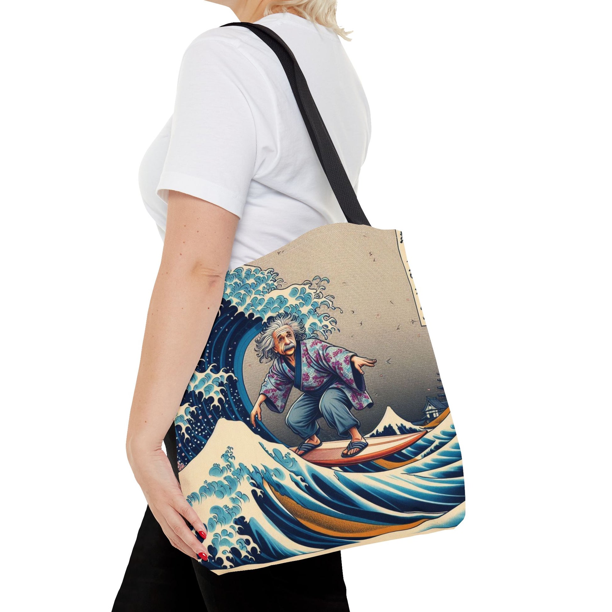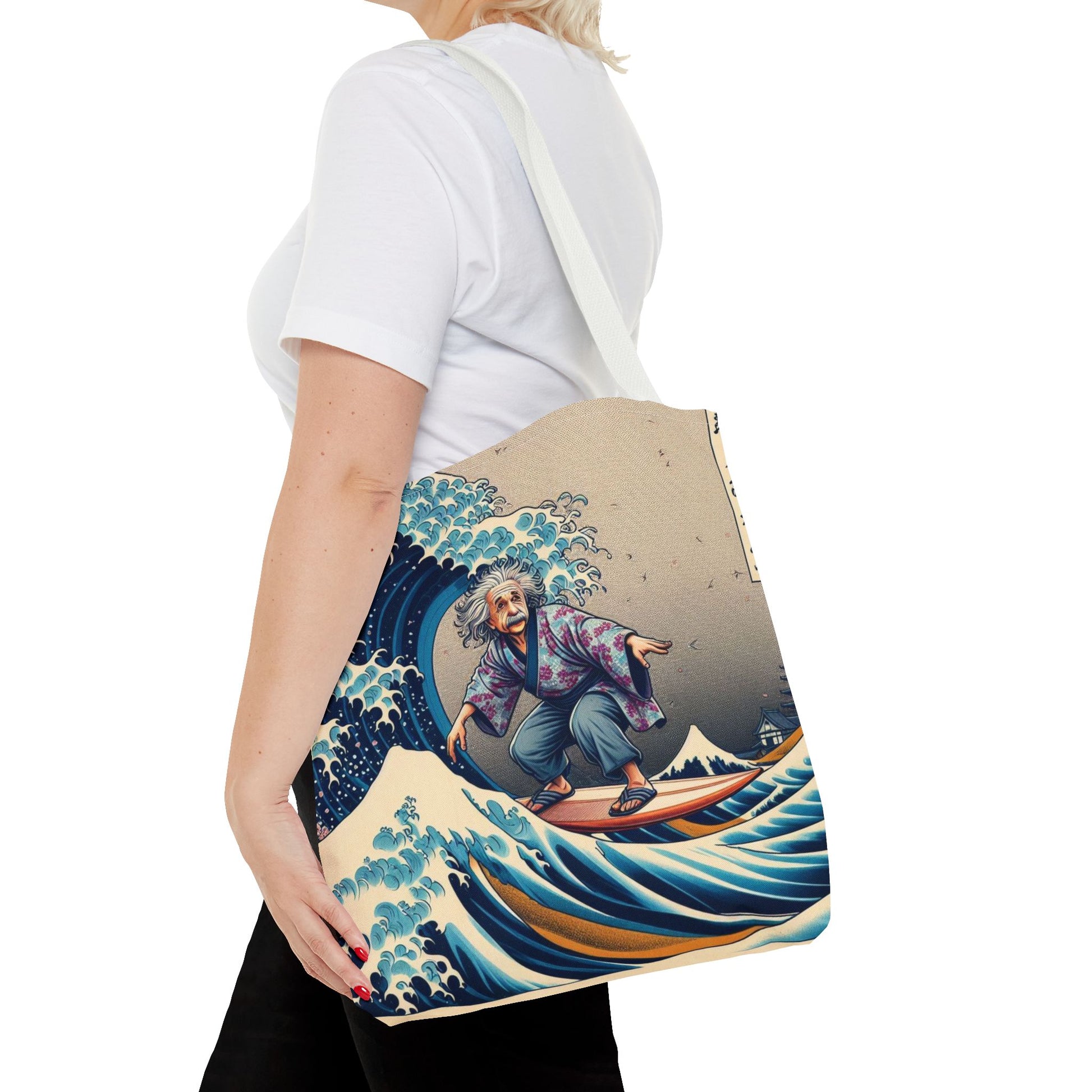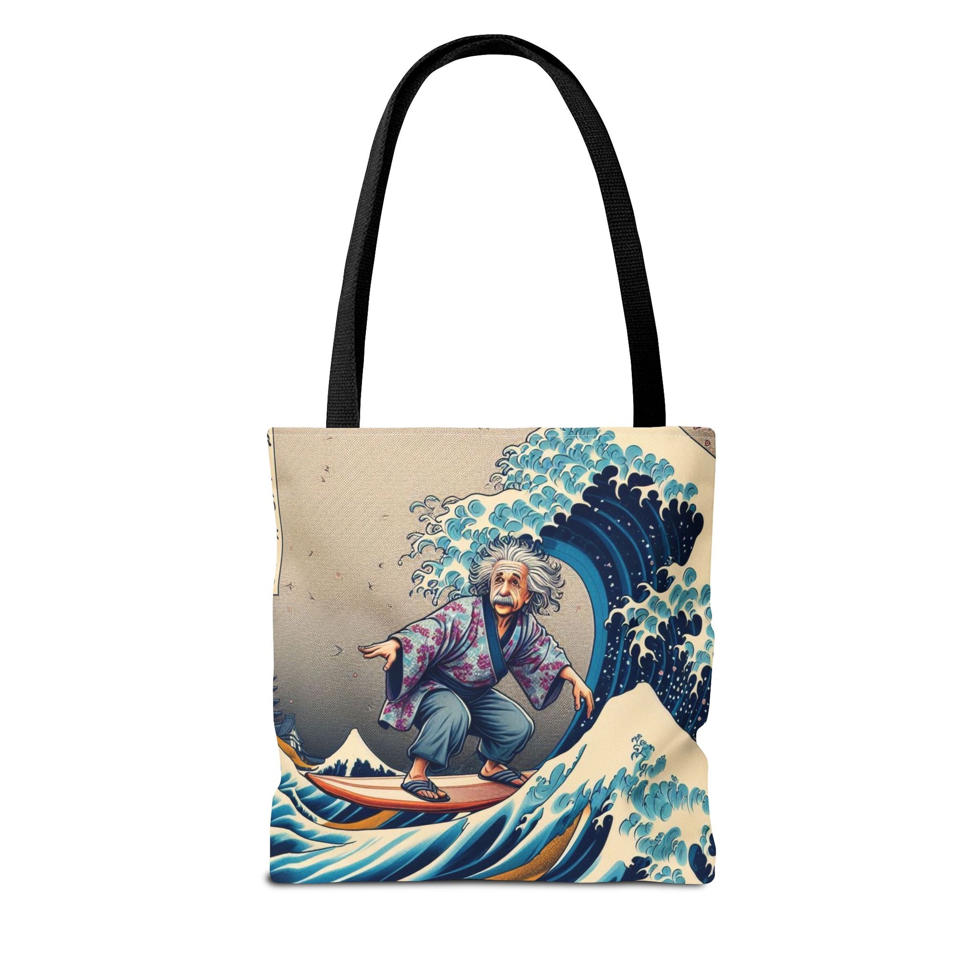 Albert Einstein catches waves with relative ease in this ukiyo-e style tote bag! The genius surfs a Hokusai-inspired swell in Japanese garb, blending physics with playful chaos. A Japanification masterpiece! 🇯🇵