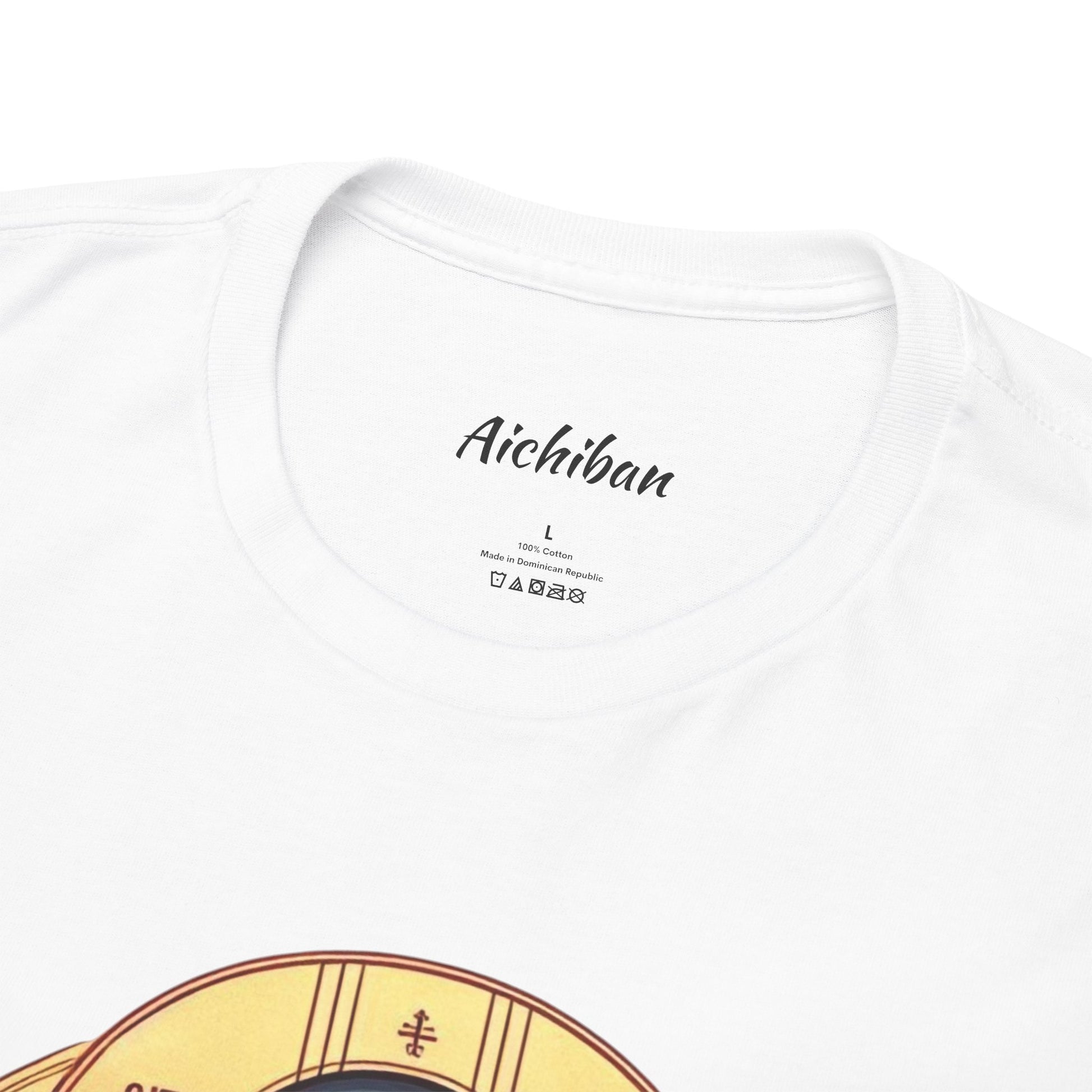 The Geisha of Sorrows Tee from the Sacred Synergy collection merges Eastern Orthodox iconography with Japanese artistry on a deep brown T-shirt. A central figure in a geisha-inspired robe cradles two children, surrounded by a golden halo and subtle Japanese motifs like flowing fabric patterns, evoking a poignant blend of spiritual depth and cultural elegance.