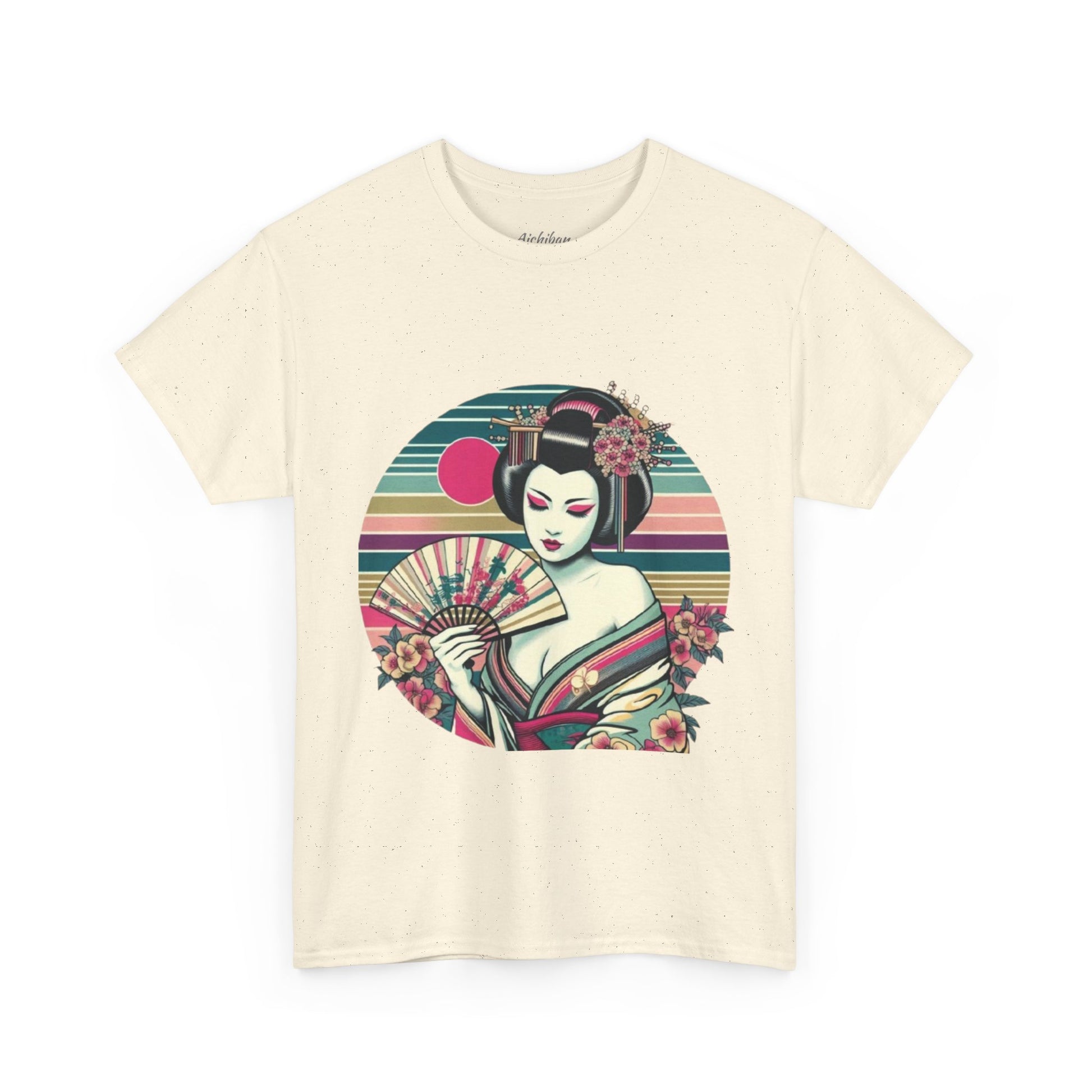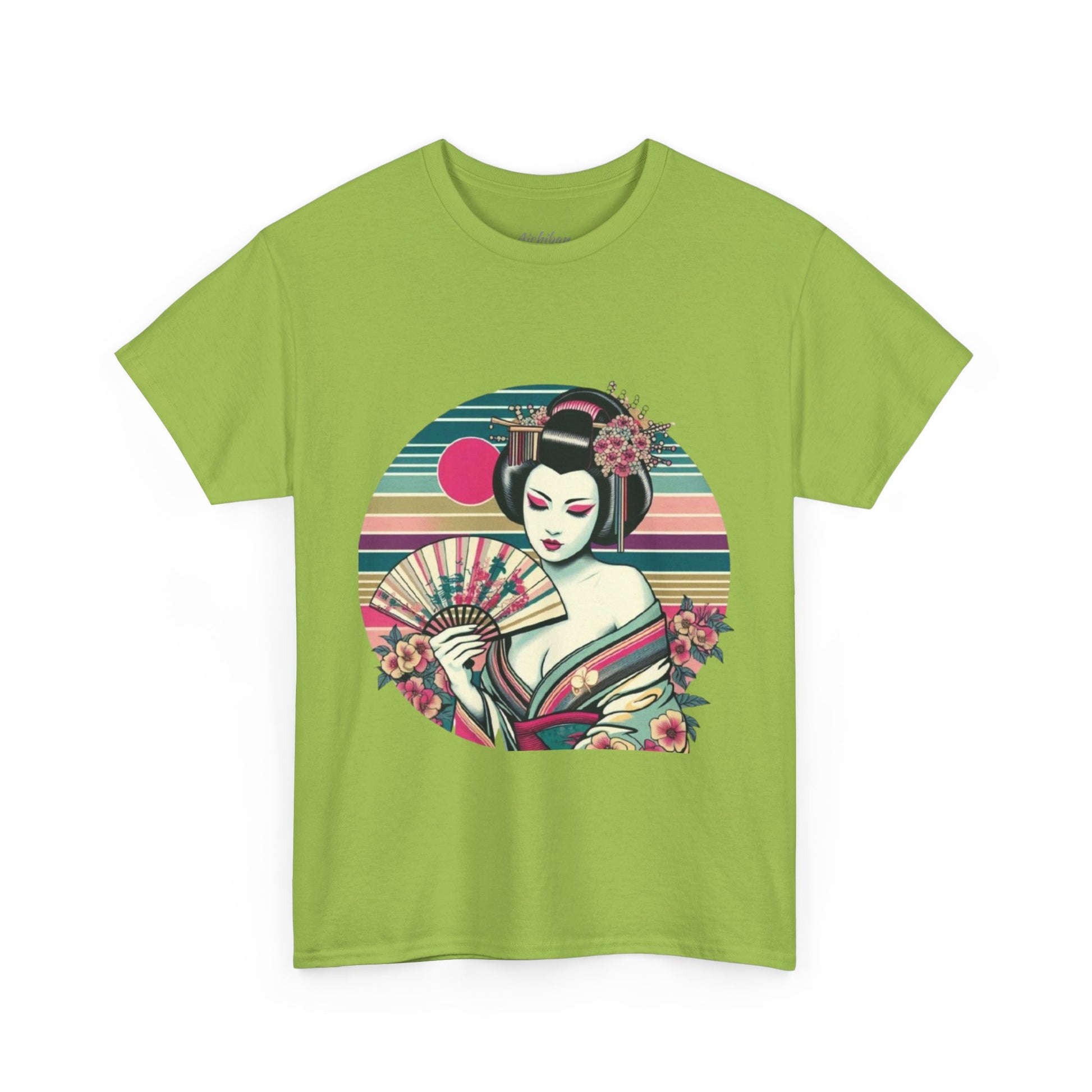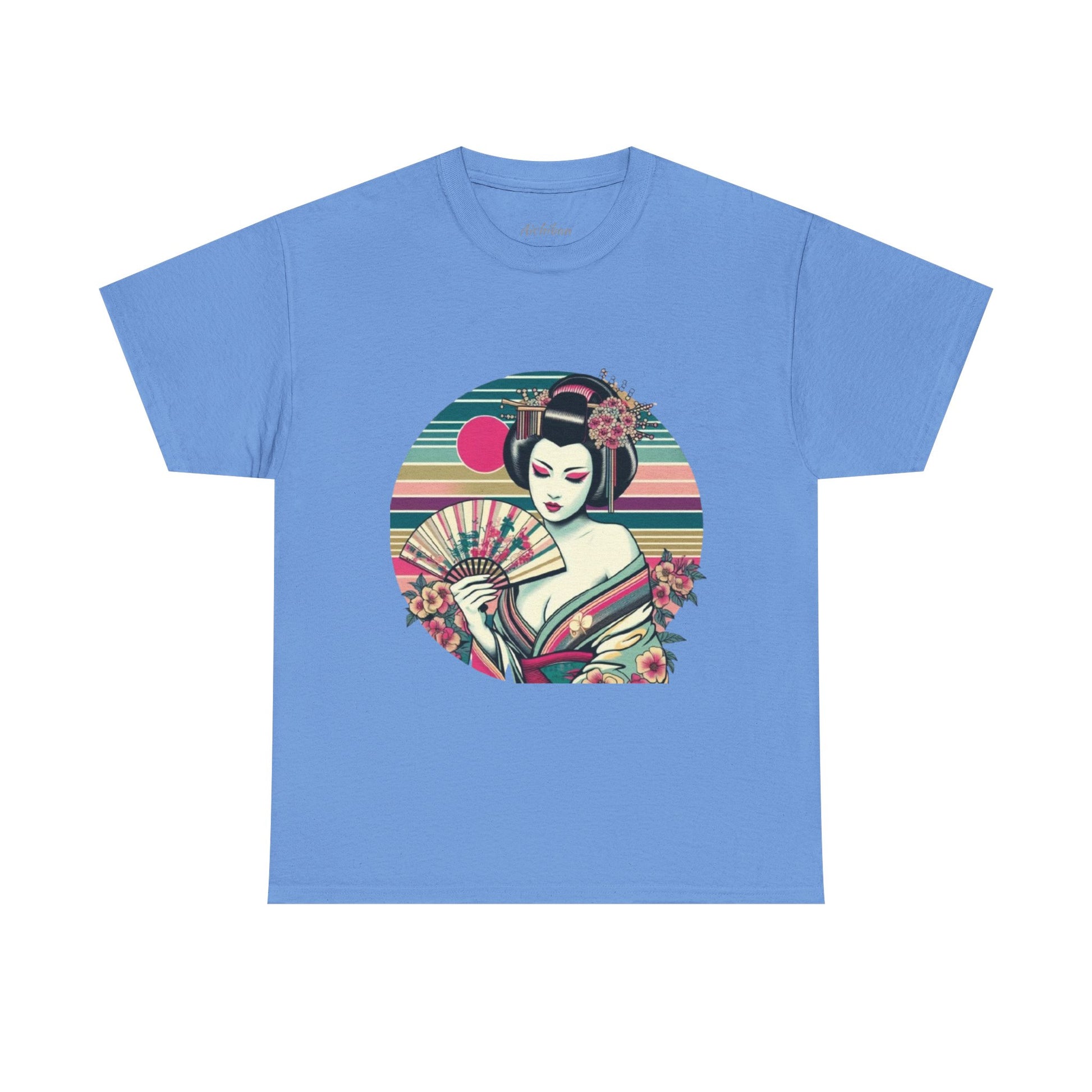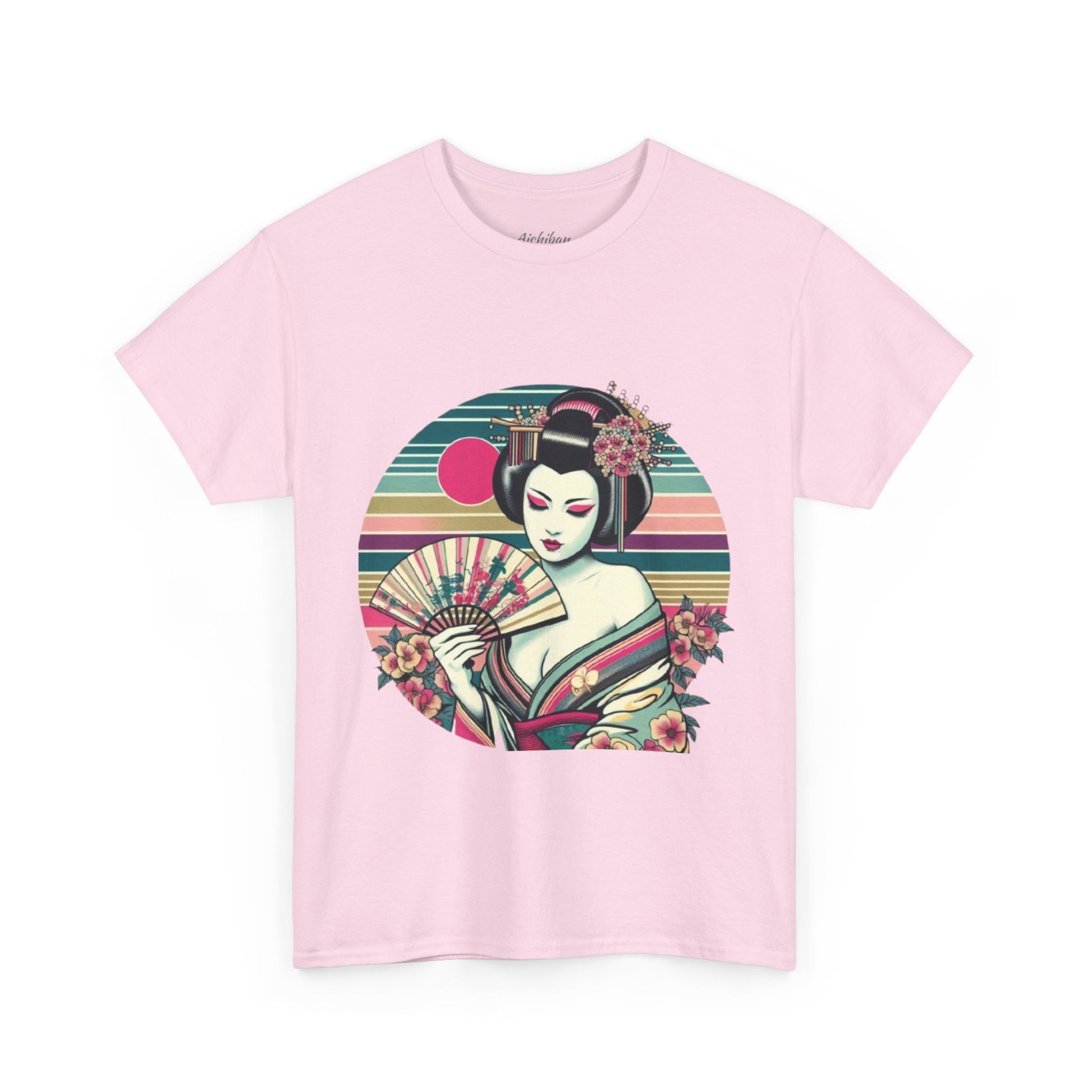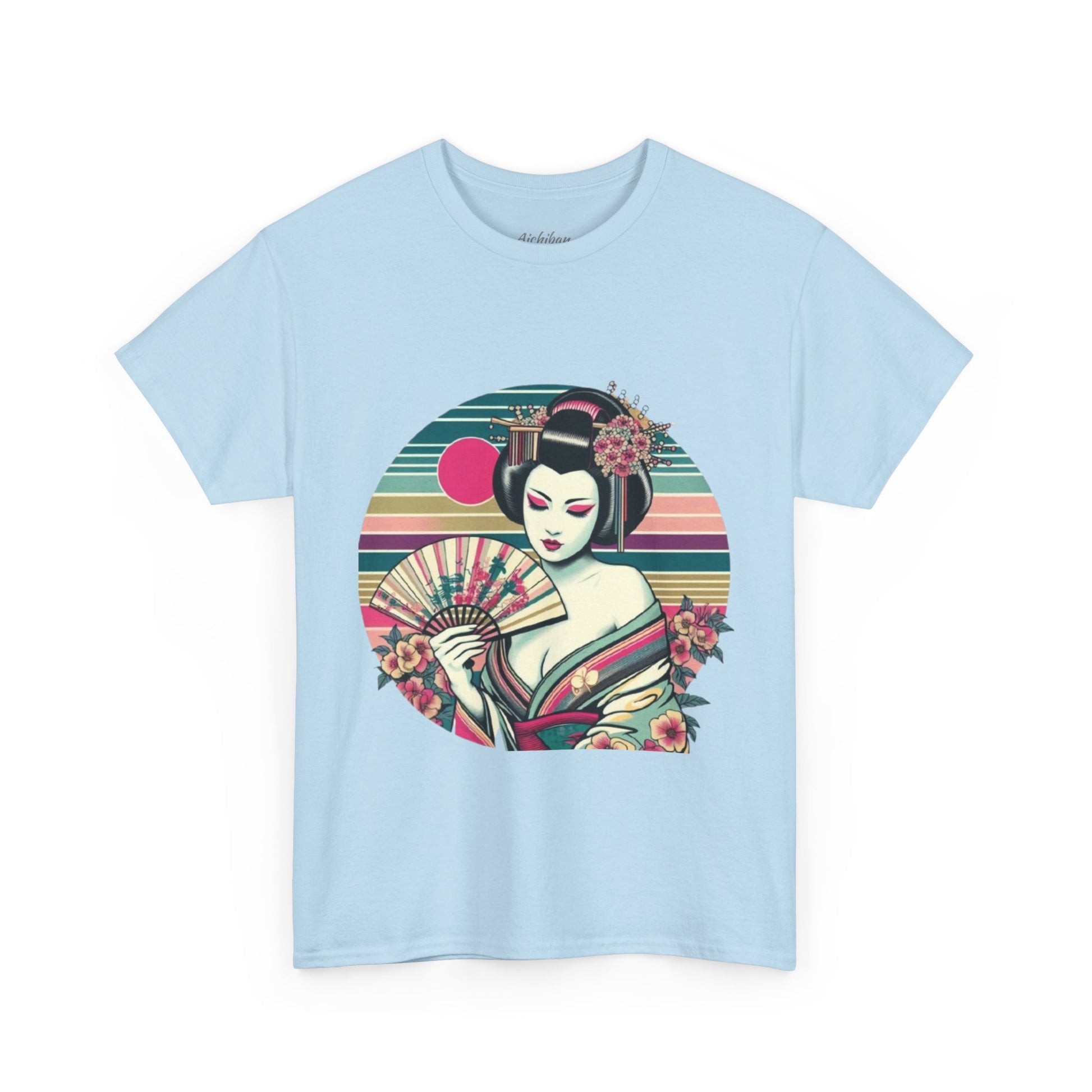 From the Peak Pastel Collection, the Geisha Sunset Tee showcases a graceful geisha in a soft-hued kimono, framed by a pastel pink and teal sunset. This tee blends traditional Japanese beauty with a calming retro aesthetic, perfect for a subtle yet stylish statement.