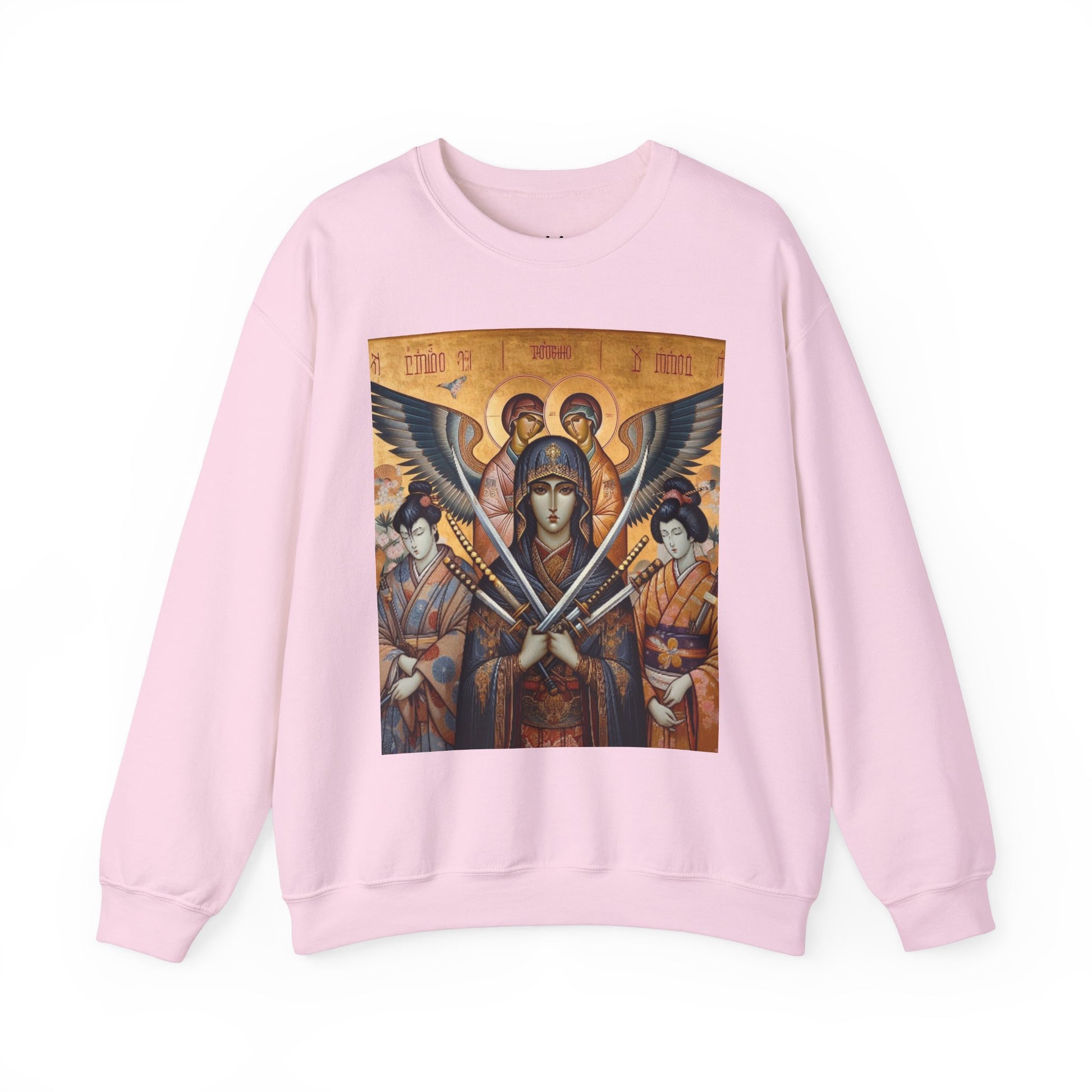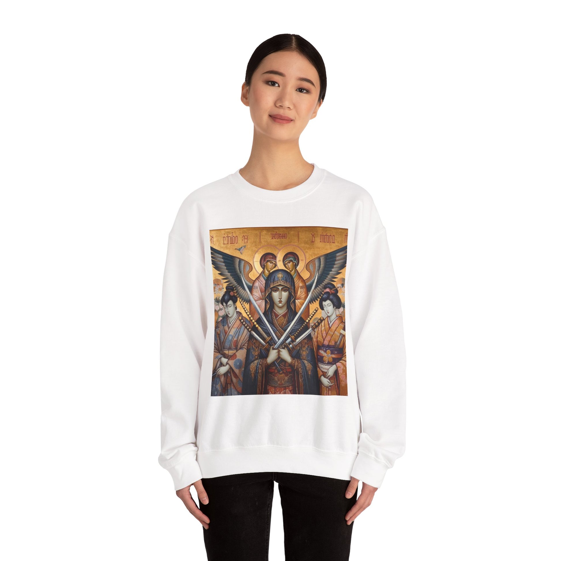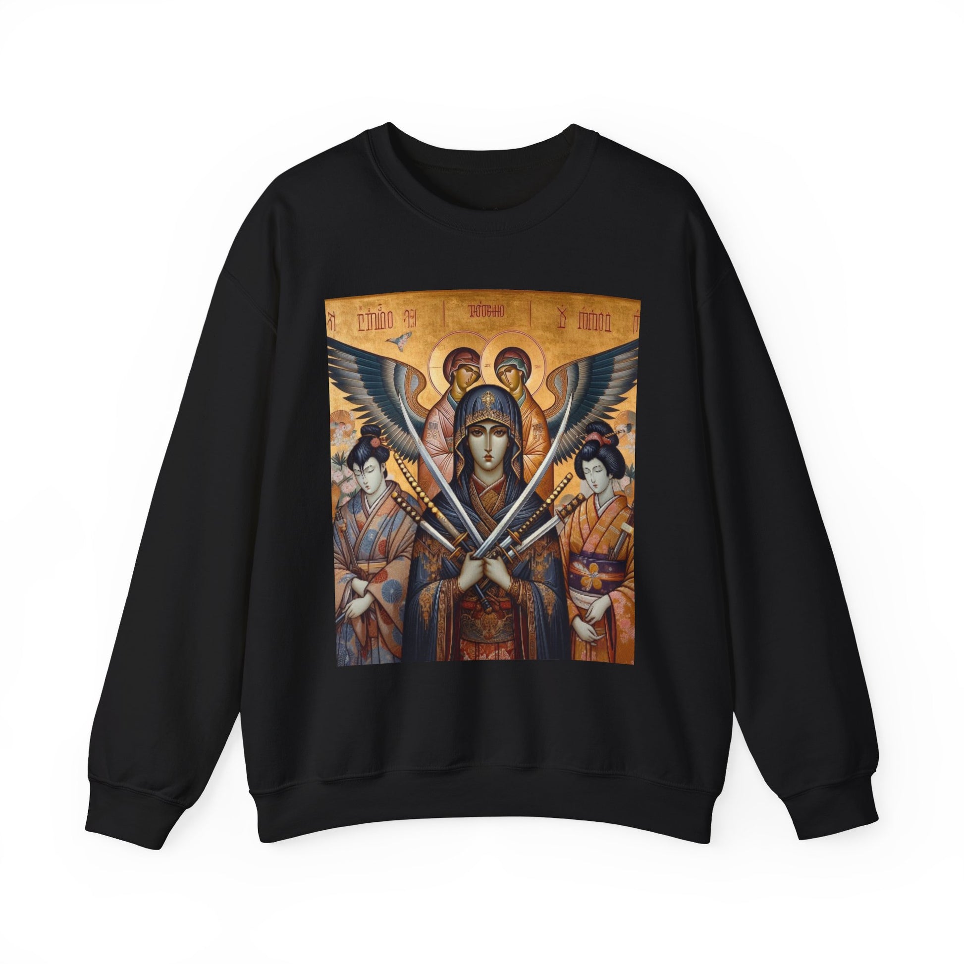 The Guardian Angel Sweater from the Sacred Synergy collection combines Eastern Orthodox iconography with Japanese artistry on a cozy black sweater. A central figure in a kimono-inspired robe holds crossed swords, flanked by two haloed guardians, with delicate Japanese patterns enhancing the spiritual and cultural fusion.
