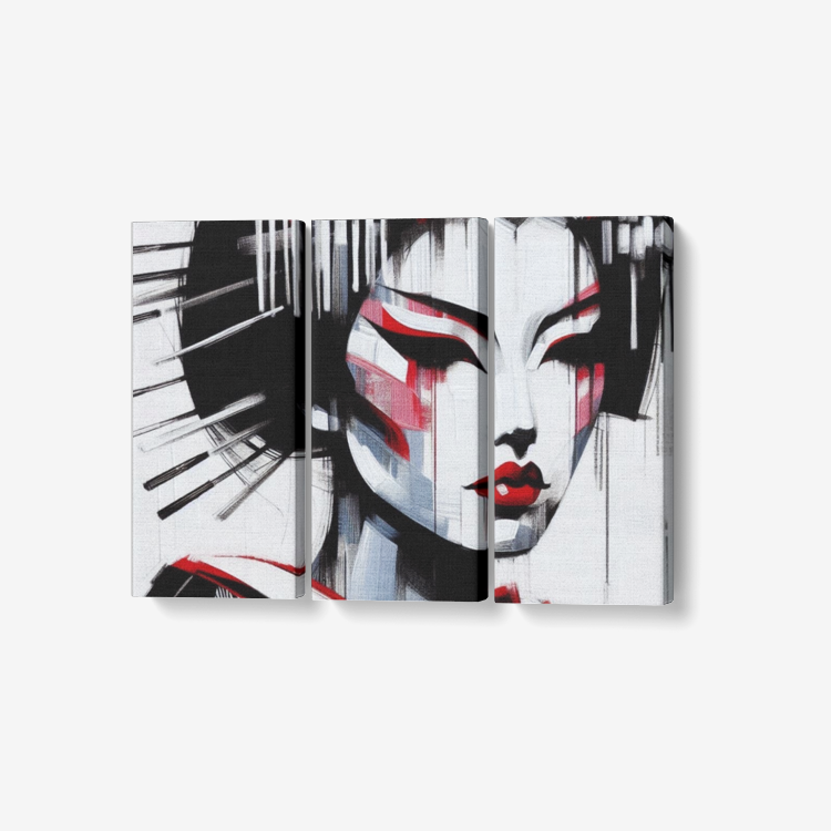 Neo Geisha Canvas is a striking triptych that reimagines the traditional Japanese geisha through a modern lens, blending abstract portraiture with bold red, black, and white hues. Angular lines and a graffiti-like style create a contemporary fusion, capturing the essence of cultural heritage while pushing artistic boundaries across three dynamic panels.