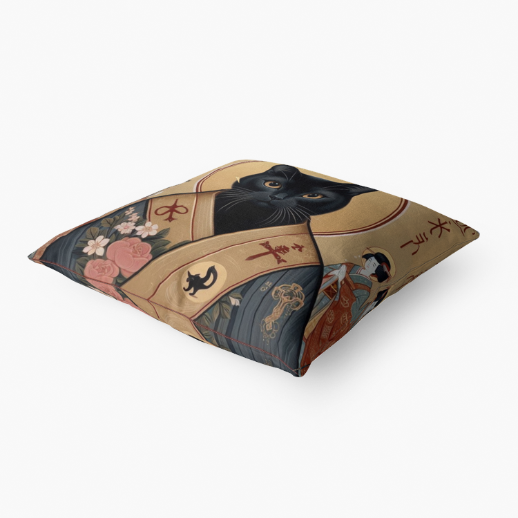 The Saint Meow Pillow from the Sacred Synergy collection features a majestic black cat in a kimono, framed by a golden halo and flanked by two geisha figures. This fusion of Eastern Orthodox iconography and Japanese art adds a spiritual touch to any space.